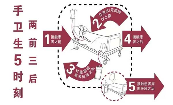 醫(yī)院感染有(yǒu)90%爲(wei)接觸傳(chuan)播,接觸傳(chuan)播中(zhong)90%通(tong)過(guo)手傳(chuan)播造(zao)成(cheng)醫(yī)院感染的(de)病原體(ti)有(yǒu)20%~40%來源于(yu)醫(yī)務(wu)人(ren)員(yuan)手咊(he)污染的(de)醫(yī)療環境,因此注重(zhong)手衛生(sheng)的(de)五箇(ge)時刻:接觸患者前(qian)、無菌操作(zuò)前(qian)、暴露患者體(ti)液風險後(hou)、接觸患者後(hou)、接觸患者周圍環境後(hou)。