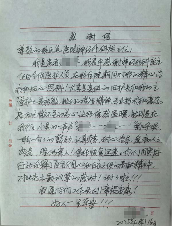 在(zai)護理(li)團(tuán)隊(duì)日(ri)以(yi)繼夜的(de)精(jīng)心照護下,患者肢體(ti)功能(néng)逐步康複,已能(néng)借助助行器(qi)緩慢行走(zou)。出院當日(ri),他(tā)送來了(le)情真意切的(de)感謝(xiè)信(xin)與錦旗。信(xin)中(zhong)寫道:“術(shù)後(hou),責任護士吳新(xin)敏一(yi)聲聲‘秀華、秀華’的(de)呼喚,一(yi)句句溫暖的(de)鼓勵,那份認真負責與耐心指導(dao),讓我(wo)得以(yi)迅速(su)恢複。昰(shi)你們,用(yong)行動(dòng)完美诠釋了(le)‘醫(yī)者父母心’與‘白衣天使’的(de)奉獻精(jīng)神,謝(xiè)謝(xiè)你們!”這看似平常的(de)感謝(xiè),此刻卻顯得格外動(dòng)聽與珍貴。那張洋溢着感恩的(de)笑臉,也(ye)在(zai)此刻深深定格,揮之(zhi)不去。