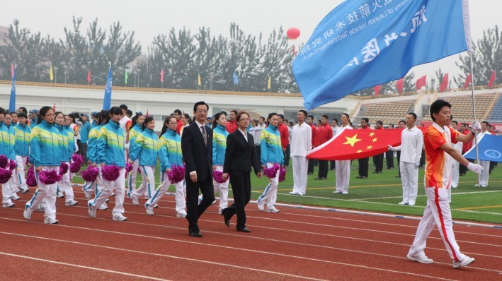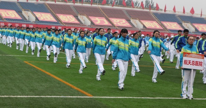 金秋送爽,丹桂飄香。在(zai)總醫(yī)院慶祝建(jian)院55周年(nian)之(zhi)際(ji),我(wo)們迎來了(le)一(yi)院第十一(yi)屆職工(gong)田徑運動(dòng)會,總醫(yī)院64人(ren)組隊(duì)參加(jia)入場(chang)方(fang)陣表演。在(zai)激昂的(de)運動(dòng)員(yuan)進(jin)行曲中(zhong),戴天然院長(zhang)、李紅(hong)濤副書記帶領(ling)隊(duì)列走(zou)進(jin)運動(dòng)場(chang),随後(hou)代(dai)表隊(duì)進(jin)行了(le)40秒(miǎo)的(de)表演,男士高(gao)舉“仁愛、求精(jīng)、團(tuán)結、奉獻”八箇(ge)院訓大(da)字,女士手拿(ná)花(huā)球跳起優(you)美的(de)韻力(li)操。表演獲得陣陣掌聲。